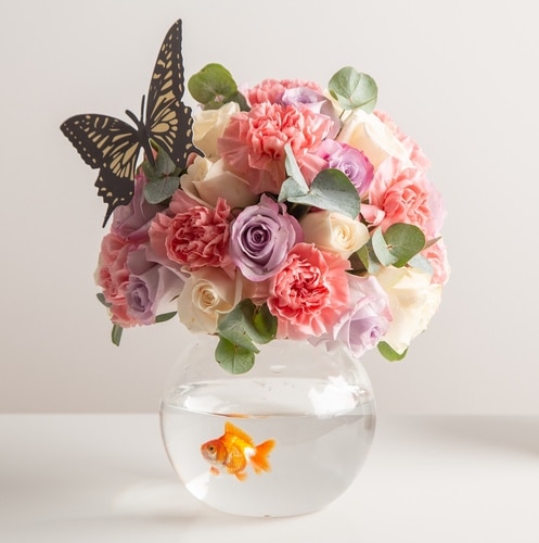 THE VASE BEAUTIFUL FLOWERS WITH 1 FISH AND FISH FOOD